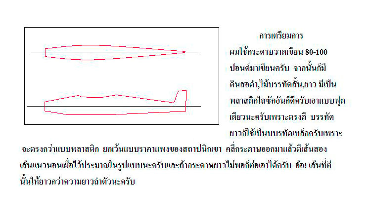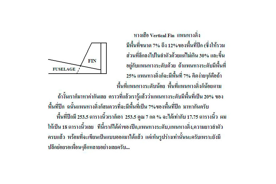 เพื่อนๆครับรู้สึกว่าผมจะพลาดไปอย่างหนึ่งแล้ว ความยาวลำตัวที่วัดจากเส้นที่ 2 ไปถึงจุด CG ขอแก้เป็น 50% นะครับเพราะถ้ารวมกับตำแหน่งเครื่องยนต์ถึง CG อีก 25% ก็จะรวมกันได้ 75% ตามที่กำหนดไว้ทีแรกนะครับ