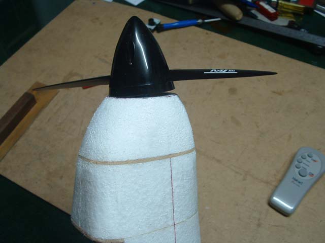 แล้วก็ตัดโฟมออกมาประกอบกันขึ้นมาเป็นลำตัว ชิ้นส่วนของโฟมที่เอามาประกอบเข้าด้วยกันก็ตามรอยเส้นที่เห็นครับ นับได้เท่าไรก็เท่านั้น