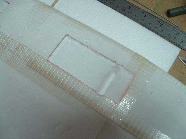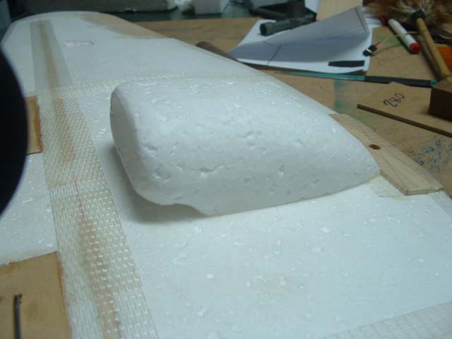 อ่ะ ทีนี้มาต่อที่ปีกครับตัดปีกด้วยลวดร้อนธรรมดา ยึดด้วยกาว แล้วเสริมด้วยเทปเส้นใย ใช้บัลซ่า 4 มิล ดามปีก ทำการมาร์คตำแหน่งแป้นขาล้อหลัก แล้วเฉาะลงไป เอาแป้นรับขาล้อหลักทาอีพ็อกซี่ใส่เข้าไป พร้อมติตั้งขาล้อหลัก+ล้อโฟมขนาด 2 นิ้ว แล้วก็เฉาะที่อยู่ให้เซอร์โว aileron อีก2 ตัว