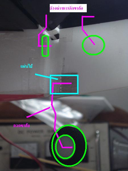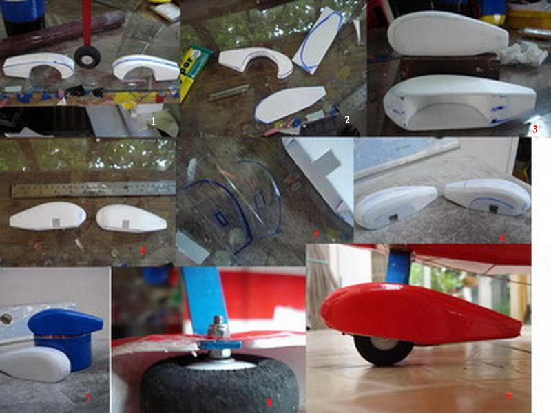 อันนี้เป็นการติดตั้งเลี้ยวล้อหลังแบบง่ายๆ โดยติดกับรัดเดอร์ ปะลวดกับแผ่นไม้แล้วฝังลงรัดเดอร์ อาศัยเลี้ยวไปด้วยกัน