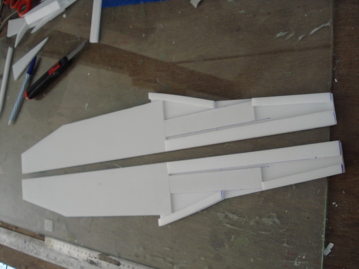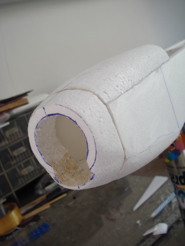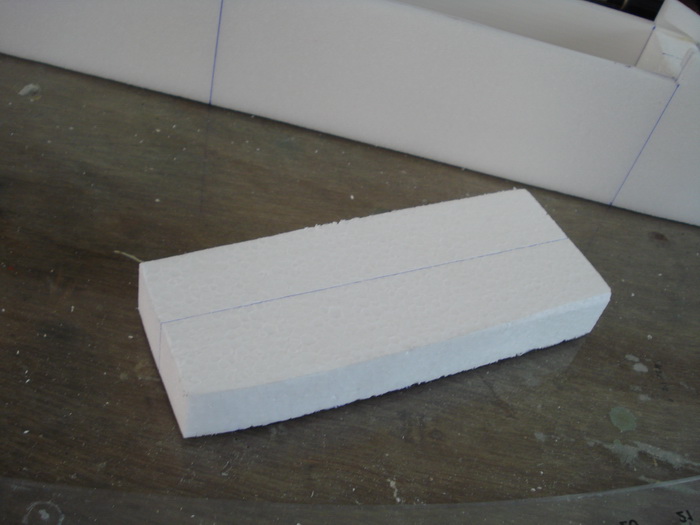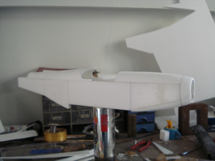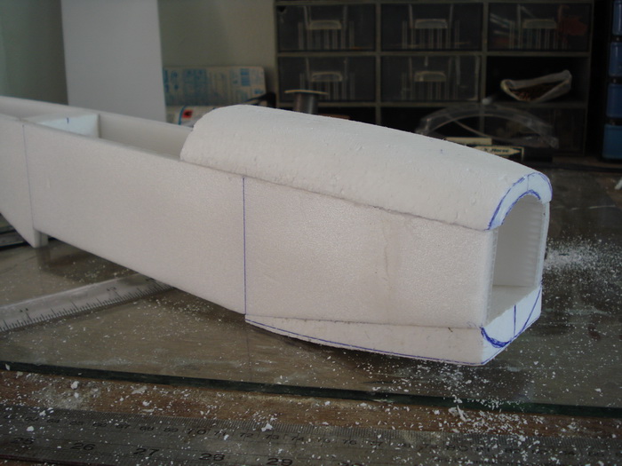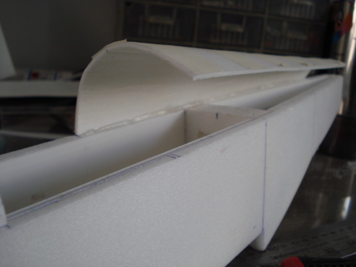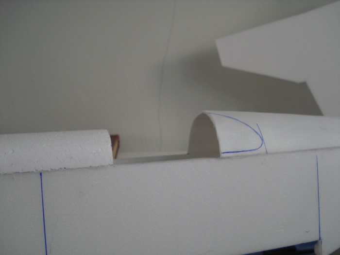 ส่วนหลังห้องนักบิน ใช้โฟมสามมิลดัด ตามภาพ เป็นการขีดนำเพื่อให้งอได้สะดวก ควรติดเทปกระดาษไว้อีกด้านเพื่อกันโฟมแตกครับ
