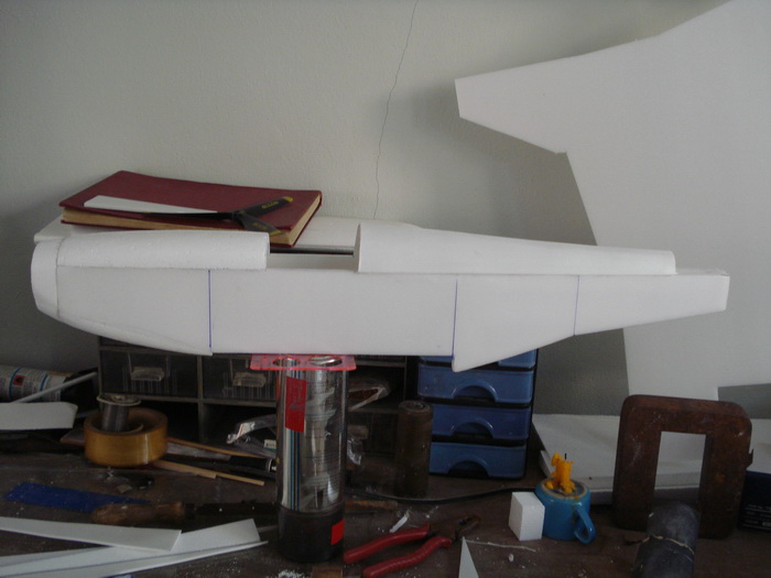ส่วนฝากระโปรงเครื่องยนต์นั้นใช้โฟม ๑.๕ ชนิดเดียวกับที่ทำปีกมาเป็นวัสดุ ตัดมาตามtopวิวของแบบเลยครับ เอายาวมาถึงหน้าปัดห้องนักบินเลยครับ