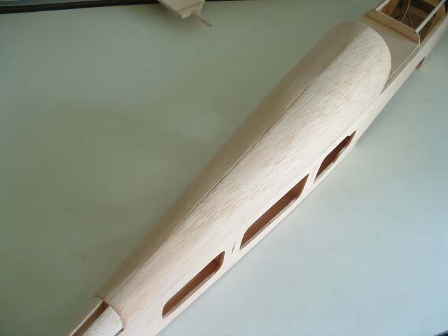 หัวห้องเครื่องเสร็จไปแล้ว ทีนี้จะมาปิดท่อนหัวกันละนะครับ ใช้บัลซ่าระแนงขนาด 4 มิล 2 เส้น ติดเข้าไป แล้วใช้บัลซ่า แผ่น หนา 2 มิล ยาวเท่าส่วนท่อนหัว มาโค้งแปะเข้าไปทั้ง 2 ด้าน ส่วนที่เกินกรีดออกด้วยคัทเตอร์ ก่อน แล้วขัดลงด้วยกระดาษทราย