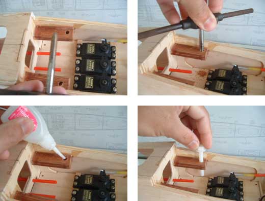 ใช้ดอกต๊าบเกลียวขนาด 1.25X6 มิล ค่อยขันต๊าบเกลียวลงไป ถ้าใจร้อน อาจทำให้เกลียวรูดได้ เสร็จแล้ว หยอดในรูเกลียวด้วยกาว CA เพื่อให้กาวไปซึมในเนื้อไม้ เพิ่มความแข็งแรงให้กับเกลียว รอจนกาวแห้งจึงทดลองเอาน็อตพลาสติกสำหรับยึดปีกไขเข้าไปดู