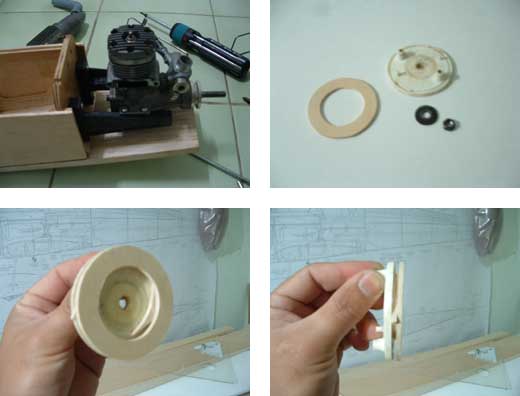 กลับมาดูที่ส่วนหัวกันต่อครับ ผมติดตั้งเครื่องยนต์เข้าไปเพื่อที่จะมาร์คตำแหน่งของสปินเนอร์ ให้เตรียมไม้อัดเบา หนา 2 มิล ตัดเป็นวงแหวนเท่ากับสปินเนอร์ แล้วใช้เทปกาว 2 หน้าอย่างบางติดเข้าด้วยกัน โดยใช้เศษไม้ที่ตัดออก รองเข้าไป1 ชั้น เพื่อให้มีช่องว่างดังภาพ