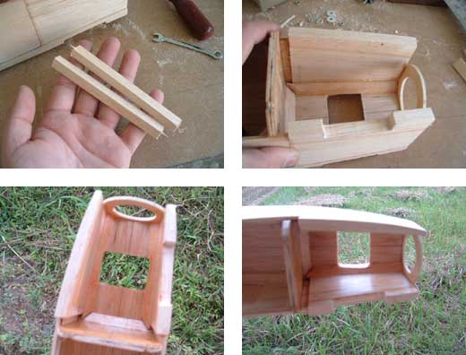 ในภาพนี้แสดงให้เห็นการเข้าไม้แบบลิ้นสอดสลัก ด้านใต้ลำตัวครับ ข้อดีก็คือ งานเรียบร้อย แข็งแรง แน่นหนาดี แต่ข้อเสียคือ ถ้าทำร่องไม่ตรง เบี้ยวทั้งลำได้ง่ายๆเหมือนกันครับ