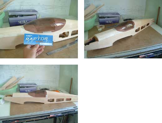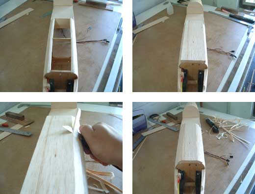 การเหลาช่องเสียบชุดหางตรงนี้ ใช้ไม้ บัลซ่า หนา 10 - 12 มิล มาแปะเสริมเข้าไปที่ส่วนปลายสุดของหาง โดยผมใช้สแตร็ป และฟิน ทดลองติดตั้ง ให้ได้ฉาก ทั้ง 2 แนว และต้องกึ่งกลางด้วย เช็คให้แน่ใจแล้ว ยึดกาว CA จุดเล็กๆแค่พออยู่เท่านั้น จากนั้นจึงนำไม้บล็อกเข้าประกบซ้ายและขวา เล็งจากเส้นหลังเครื่องให้เอียงเท่ากัน แล้วรื้อเฉพาะฟินกับสแตร็ปออกไปก่อน ใช้คัทเตอร์ค่อยเหลาแบบหยาบๆก่อน เมื่อขนาดลดลงแล้ว จึงขัดด้วยกระดาษทรายบล็อกจนเรียบเท่ากัน