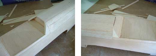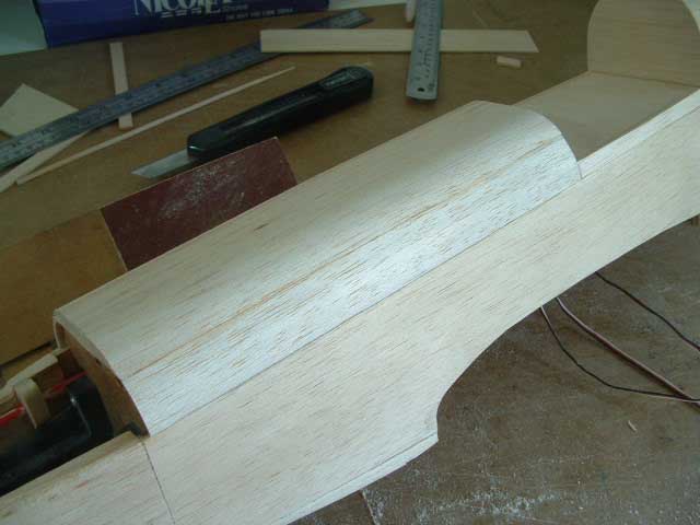 เมื่อปาดและขัดเรียบแล้ว ก็เอาบัลซ่าบล็อกหนา 10 มิล ยาวเท่าส่วนท่อนหัวเครื่อง มาแปะเข้าไป จากนั้น ค่อยๆเหลาด้วยคัทเตอร์ ออกคร่าวๆก่อนเป็นการลดขนาด