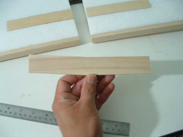 นำไม้บัลซ่าขนาด ขนาด 10 มิล * 13 มิล ยาวเท่าความยาวปีก 2 อัน เอามาทำชายหน้าและขนาด 10 มิล * 8 มิล 2 อัน เอามาทำชายหลัง ที่เราตัดเตรียมเอาไว้เมื่อคราวนู้น มาติดกาวเข้าไปกะปีกครับ ทั้งชายหน้าและชายหลัง เสร็จแล้วตัดส่วนที่เกินออก แล้วขัดมุมชายหน้าให้เข้ารูปกับรูปแบบของแอร์ฟรอยด์ของปีกครับ