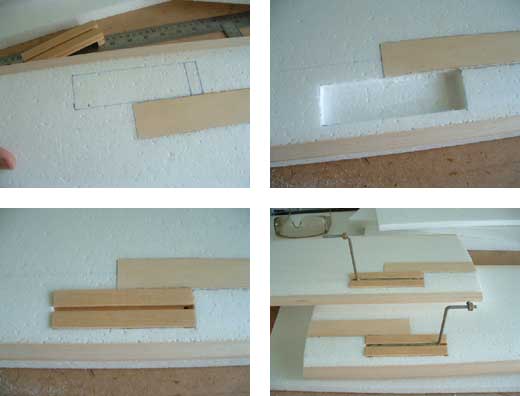 แล้วก็มาวัดทำเครื่องหมายบนตัวปีก เดี๋ยวเราก็จะกัดร่องลงไปบนโฟม เท่ากับไม้ยึดขาล้อที่ทำเอาไว้ แล้วก็ทดลองใส่เข้าไปดูก่อน เมื่อได้ที่แล้วก็จับมาทากาวแล้วใส่ลงไปจริงๆ