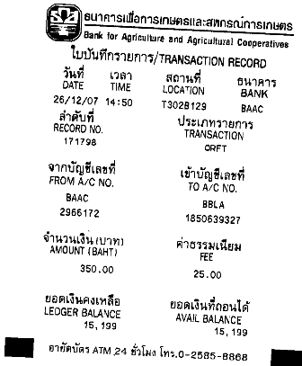 พี่ตี๋เก่งครับผมส่งเงินไปทางธนานัติออนไลน์ให้พี่นะครับ144+10+32= 186 บาทตามที่อยู่ตรงหน้าซองนะครับ(ไปรษณีย์ที่พี่ส่งของมาให้ผมนั้นแหละครับพี่เอาบัตรประจำตัวพี่ไปเอาเงินได้เลยครับ)พอดีโอนทางธนาคารมีปัญหานิดหน่อยครับขอโทษจริงๆครับ....วินัย บัวหลวง