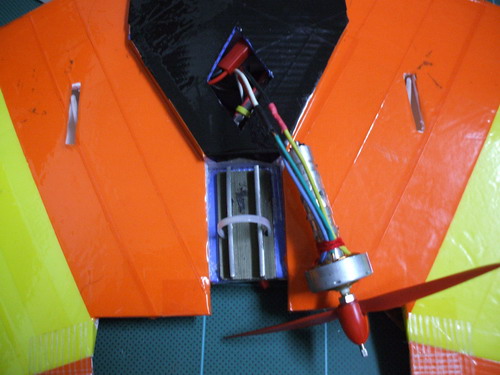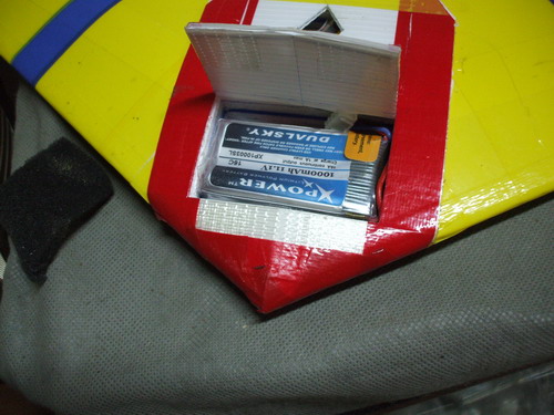 การใส่แบตนั้นจะใส่จากด้านล่างของปีกบินแล้วใช้เทปใยสับปะรดปิดตรงฝาเพื่อบินครับ ไม่ต้องกลัวเทปหลุด ขนาดผมหัดบินใหม่ หัวหมงโลก ยังไม่หลุดเลยครับ แบตตั้งแต่ลำแรกทุกวันยังเล่นได้อยู่เลย แต่เท่านที่ทดลองทำดูแบตที่เหมาะกับการใส่แบตลักษณะนี้ต้องมีน้ำหนักไม่น้อยกว่า 70 กรัม เพราะพื้นที่ในการขยับแบตมีน้อยครับ