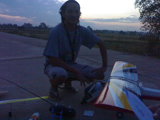 ฝากข่าวถึงน้องอ๊อฟ หลังจากที่ได้เครื่องร่อน 2 Ch จากน้องอ๊อฟไปนอนกอดอยู่หลายคืน เช้าวันที่ 5 ธันวา ครูก๊อตก็นำเอาไป FF สงสัยคงกลัวเครื่องพัง เอาเนตประตูฟุตบอลเป็นรัยเวย์ เที่ยวต่อมาก็ใช้ยอดไม้เป็นที่จอดอยู่ 3-4 เที่ยว พอครูโอ๊ะมาเจอปรับแพนหางให้ใหม่ ก็บินฉิวเลย ตอนนี้ปวดเรื่องบินมาก ว่างเป็นไม่ได้ ไม่ได้บินแล้วนอนไม่หลับ ยังงี้แสดงว่าเชื้อเริ่มออกฤทธิ์ เห็นว่าน้องออฟเคยแพร่เชื้อให้ตั้งแต่อยู่ อ.เพ็ญ หลายปีมาแล้วแต่ไม่สำเร็จ (แสดงว่าครูโอ๊ะเชื้อแรงกว่า อิอิอิ....) สงสัยไม่นานคงพัฒนาไปเล่น 4 Ch แน่ๆเลย ครูโอ๊ะได้แต่กระซิบๆ...อย่าลืมหนี้เด้อ ...ค่าเครื่องร่อนน่ะ มีตังแล้วเอาไปจ่าย ไปกินเ...ล้าบึงกาฬด้วย.....