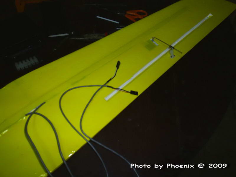Servo ควบคุมปีกเล็กแก้เอียง ... ติดตั้งที่ปีกข้างละ 1 ตัว รวมเป็น 2 ตัว แล้ว Mix ให้มันทำงานร่วมกัน ... ผมชอบแบบนี้เพราะว่าหากตัวใดตัวหนึ่งเกิดเดี้ยงขี้เกียจทำงาน อย่างน้อยผมยังเหลืออีกตัวเอาไว้กัน ... แล้วก็ลงฉุกเฉินได้ ส่วนสายพ่วง Servo ... ทำมือ ... มันคือสาย Audio ของ CD-Rom ขอรับกระผม ... กำละ 20.-บาท