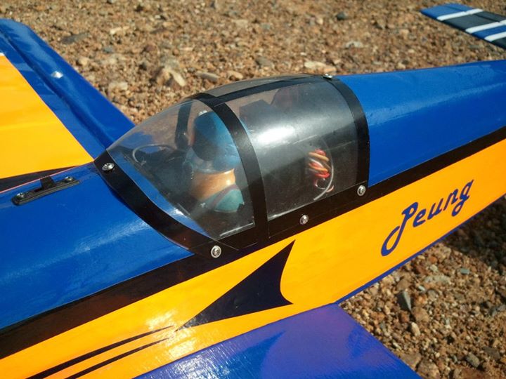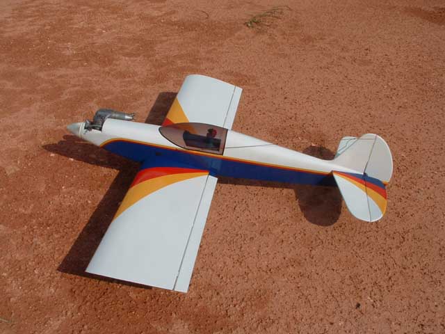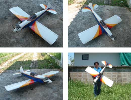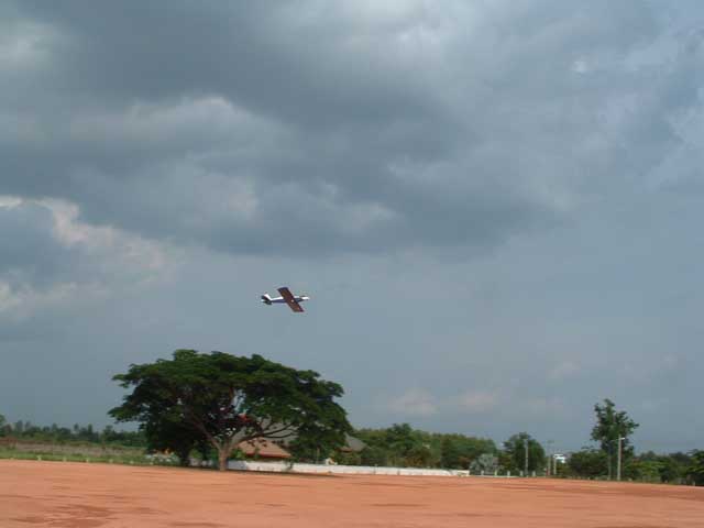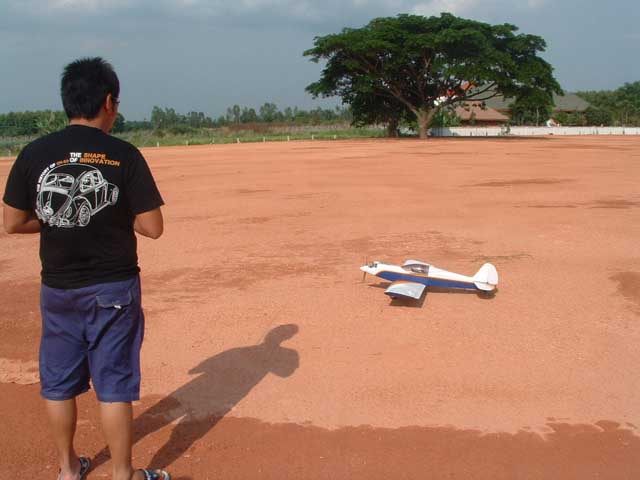 หลังจากเติมน้ำมันเต็มถังเสร็จ และคราวนี้เลือกที่จะใช้ไนโตร 5 % เพื่อกันเครื่องดับตอนยกตัวไต่ระดับ ก็แท็กซี่เครื่องวนไปวนมาบนพื้นเพื่อดูการทำงานของรัดเดอร์ ว่าวงเลี้ยวเพียงพอมั๊ย แล้วก็ทำการลองวิ่งทางตรงเร็วๆดูว่าหางจะยกที่ความเร็วเท่าไร เมื่อทุกอย่างเรียบร้อย น้องอั๋นก็นำเครื่องไปที่สุดปลายสนาม แล้วก็ค่อยๆเร่งเครื่องมา พอความเร็วได้ที่และหางเครื่องบินยกขึ้นแล้ว ก็เร่งออกไปเต็มที่ เครื่องวิ่งบนพื้นได้ตรงดี ใช้ระยะทางประมาณ 15 เมตร เครื่องก็ลอยตัวขึ้นสู่ท้องฟ้า ในขณะที่ทำการบินทดสอบนั้นลมค่อนข้างแรงพอสมควร เมื่อนักบินนำเครื่องเข้าสู่วงจรการบินแล้ว การปรับทริมก็เริ่มขึ้น แต่ เท่าที่ดู เค้าทริมAileron ซ้ายไป 5 กิ๊ก นอกนั้น ไม่มีอะไรต้องทริมครับ หลังจากปรับทริมเสร็จก็เริ่มทดลองการบินRoll และLoop ดู เครื่องก็สามารถทำได้ดี และทำท่าทางได้สวยงาม แล้วก็ลองบิน Nife edge ก็พอทำได้ แต่ต้องเร่งเครื่องเติมให้มีความเร็วซักนิด ท้ายสุด ก็ลองลดคันเร่งบินความเร็วต่ำ ทาบสนามเพื่อหาความเร็วร่อนลง แล้วก็นำเครื่องลงสู่สนามได้อย่างปลอดภัย
