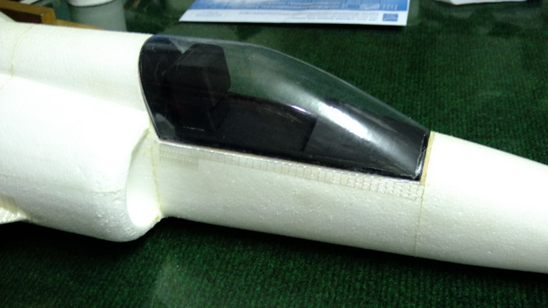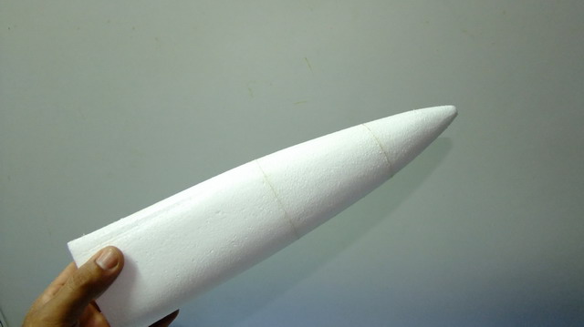 ส่วนหัวแหลมๆที่เรากลึงเสร็จแล้ว นำมาประกอบเข้ากับส่วนที่เหลือ ก็จะได้เป็นส่วนหัวของเครื่องบิน และจะเป็นที่อยู่ของแบ็ตเตอรี่