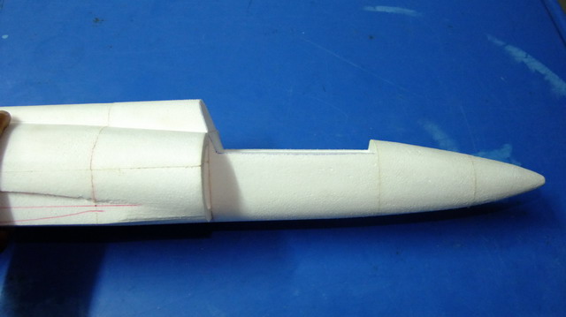 ทาบแบบแอร์ฟอยด์ที่เราเลือกใช้ลงไปที่ตำแหน่งข้างลำตัว แล้วใช้มีดคัทเตอร์ค่อยๆแซะโฟมออกแล้วขัดให้เรียบเพื่อเตรียมติดตั้งปีก