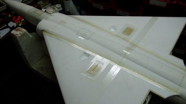 ด้านใต้ลำตัว ผมเริ่มงานด้วยการติดเทปเส้นใยตามรอยต่อส่วนต่างๆเพื่อเพิ่มความแข็งแรง