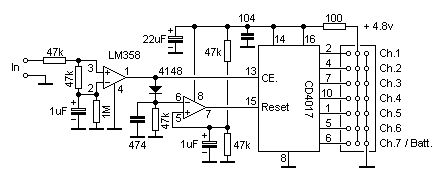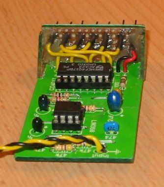 ใช้งานได้จริงครับผมเองก็ทดลองใช้โปรแกรมซิมมูเลตวงจรดูแล้วปรากฏว่าใช้งานได้ครับสัญญาณออก TRหาง่ายแต่ตอนถอดรหัสผมใช้วงจรที่ผมแก้ไขใหม่ปกติวงจรเดิมของที่ผมลงไว้ว่าชุด 2 แชนแนลเวลาถอดมันถอดได้แค่สองช่องถึงแม้ว่าเราจะเพิ่มรหัสที่ภาคส่งแล้ว เนื่องจากค่า RC ที่ใส่ไวเดิมนั้นแหละครับของเดิม ค่า C แทนทาลัม 3.3uF + R 150K เปลี่ยนเป็น C1.1uF R47K เสร็จแล้วของเดิมป้อนต่อ Data 74LS164 แก้ใหม่ตัด ตัดรายทองแดงแล้วป้อนให้74LS04ที่ขา11นำสัญญาณจากขา10ของ74LS04ป้อนให้ขา Data 74LS164 เท่านี้ภาครับเดิมที่เป็น2ช่องก็กลายเป็น8ช่องแล้วครับ
