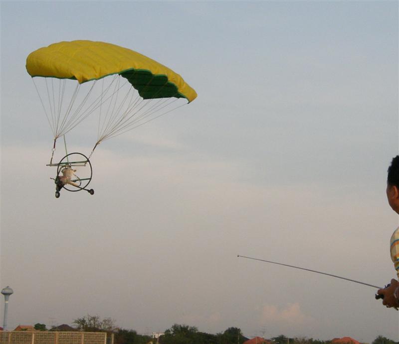 ต้องยอมรับว่า เรื่องการบินของผมยังไม่เป็นที่พอใจครับ...ตอนเลี้ยวเราต้องลุ้นกันน่าดูว่าเมื่อไหร่จะเลี้ยวเสร็จ ....และพอระยะหนึ่งก็เริ่มไม่เลี้ยวแล้ว ผมเองก็ยังไม่รู้ปัญหาว่าเป็นเพราะอะไร.....ตอนเลี้ยวเข้าหาลม ร่มก็พับล่วงลงมาเลย อันนี้น่าจะเป็นเรื่องกำลังลม ทิศทางลม