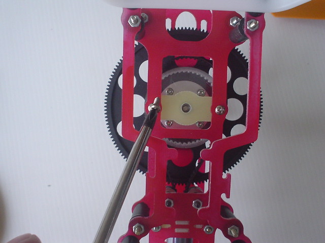ใส่ชุดเมนเกียรเข้าไป โดยให้ พู่เลย์ อยู่ด้านล่าง แล้ว ใส่สลัก เข้าไป ตามด้วย กดสลักให้จมลงในพู่เลย์