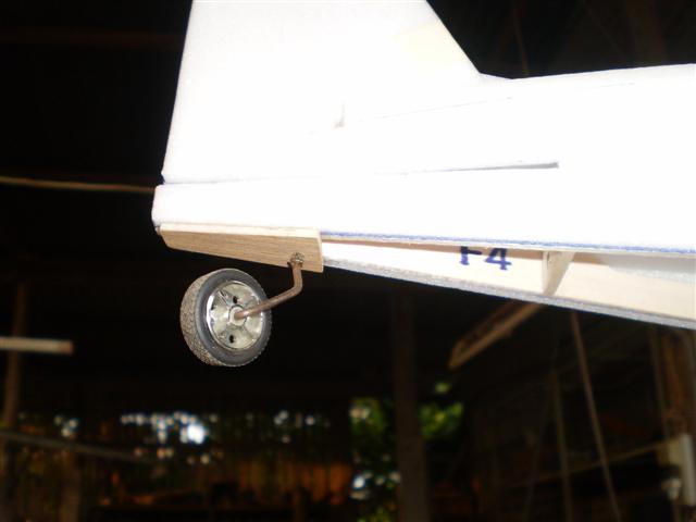ดัดลวดขาล้อ แล้วประกอบกันกับแผ่นไม้ที่ใช้ทำฐานก่อนจะใช้กาวติดเข้ากับลำตัว บ.