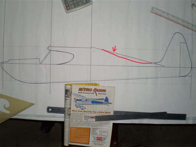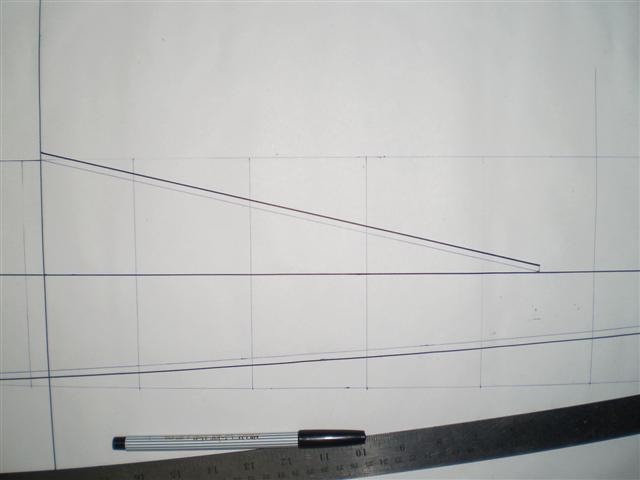 ตรง A กับ B ขนานกันนะครับที่เส้นสีเขียว (ทับเส้นเสกลพอดี) แล้วเราก็ตีเส้นให้แถบหน้าลำตัวสูงขึ้นมาซักหน่อย ผมให้สูงขึ้น 1-2 ม.ม.ก็อยูที่ประมาณ 1 - 1.5 องศาครับ แค่นี้ก็น่าจะพอแล้วกับปีกที่มีแอร์ฟอยด้านล่างแบนๆ
