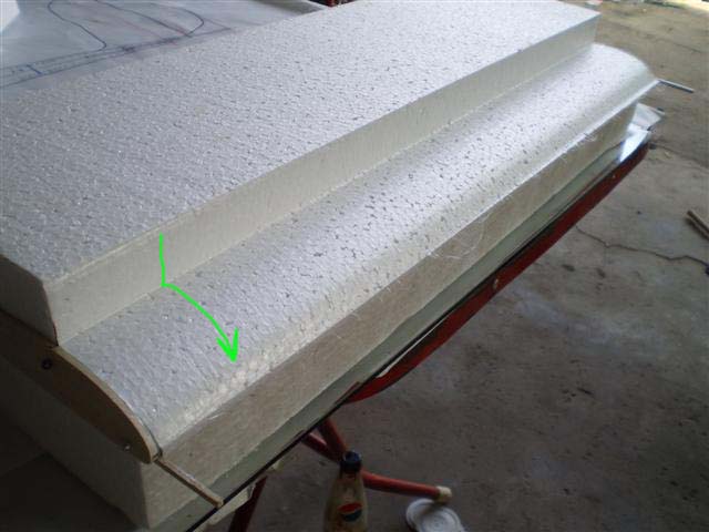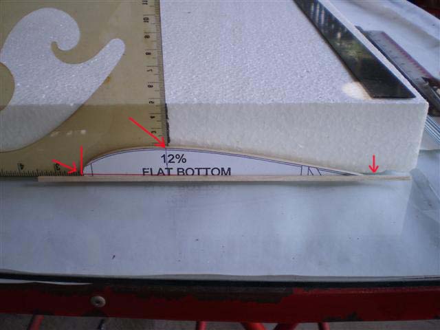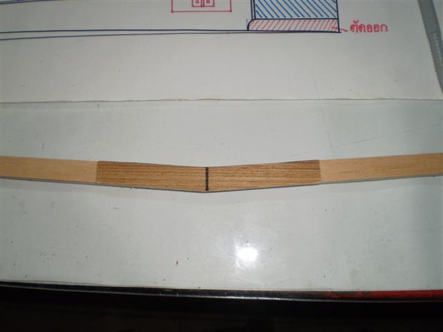 เห็นไหมครับว่าการเขียนแบบมันทำให้เราเห็นล่วงหน้าได้เสมอ ผมหาเศษไม้มาทาบลงบนแบบเพื่อสร้างมุมตัดโคนปีกตามภาพนะครับ โดยผมต้องทำไม้แบบสองชิ้นเพื่อที่จะติดด้านหน้าและหลังของชายปีก...