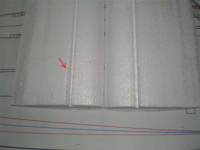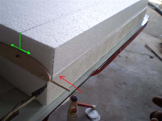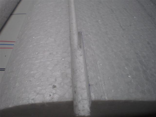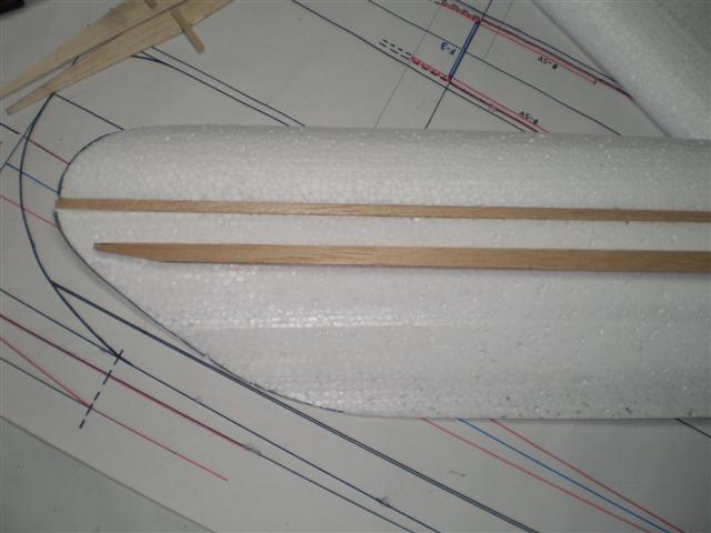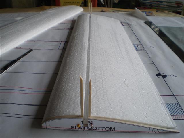ไม้ที่ติดกับแอร์ฟอยเส้นเล็กๆทั้งสองอันให้แกะออกมาแล้วตัดยาวพอประมาณ แล้วเอาแอร์ฟอยมาตัดร่องฝังสปาปีกโดยแอร์ฟอยอันเล็กทำร่องลึกประมาณ 10 ม.ม.อันใหญ่