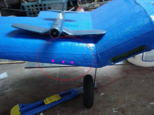 จากนั้นเจาะส่วนบนทะลุลงมา แล้วใส่บูทไว้ที่ส่วนล่าง(เลข2) เพื่อเป็นตัวป้องกันโฟมยุบ เมื่อได้ที่แล้วก็ดัดปลายลวดส่วนบน(เลข1) เพื่อเสียบกับrudderจะได้ทำงานพร้อมกันโดยใช้เซอร์โวพียงตัวเดียว