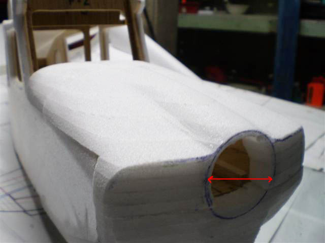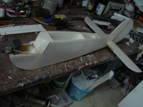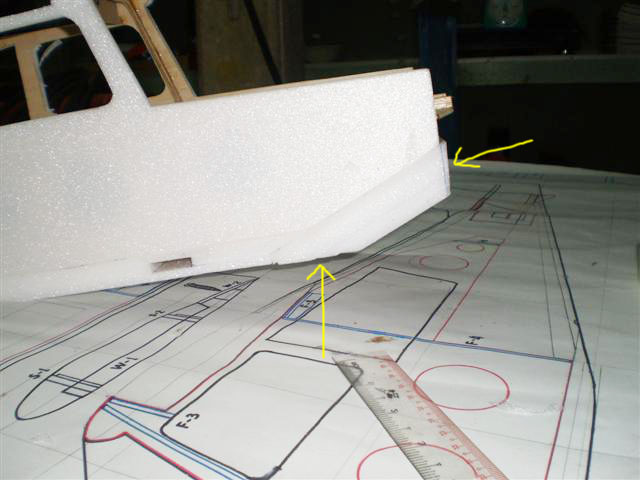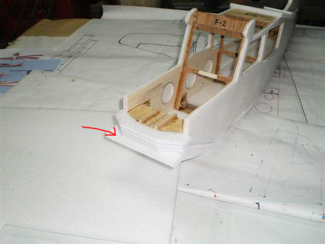 เมื่อคืนผมเอาโฟม 5 ม.ม.แปะเข้าไปที่ใต้ท้องอีกหนึ่งแผ่นเพราะความหนายังไม่ได้ตามแบบ (ศรชี้) และแปะส่วนหัวด้านล่างไปอีกตามที่เขียนไว้ แล้วจะตัดตามแนวที่ร่างเอาไว้นะครับ..