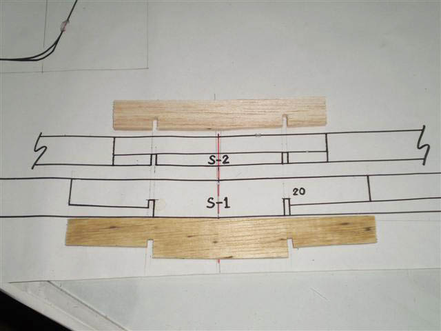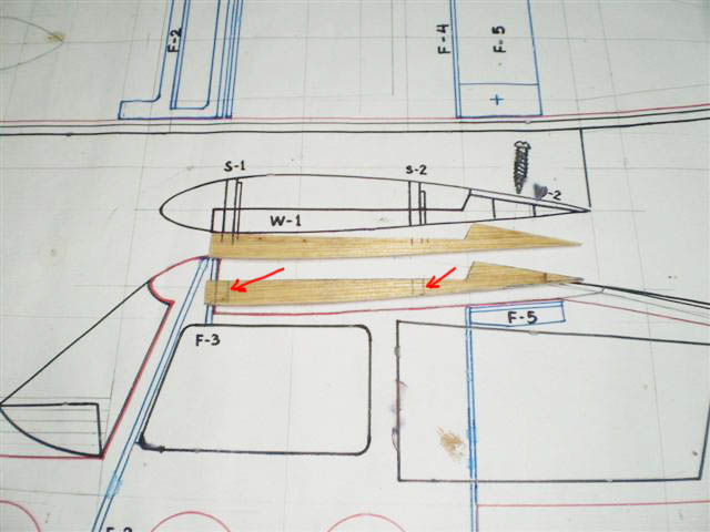 ตามแบบจะเห็นว่าความหนาของไม้สองอันที่ผมทำจะมีรูปร่างลาดเอียงไปกับ w-1 นะครับ พอติดเข้าที่ดีแล้วก็จะต้องเจาะรูที่ไม้สองแท่งนี้เพื่อขันเกลียวปล่อยเอาไว้ยึดปีกกับลำตัวครับ เมื่อขันเกลียวปล่อยเข้ามาแน่นแล้วไม้สองชิ้นนี้จะเป็นตัวกันไม่ให้ปีกยุบไปมากกว่านี้อีกยังไงหล่ะครับ..
