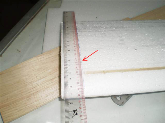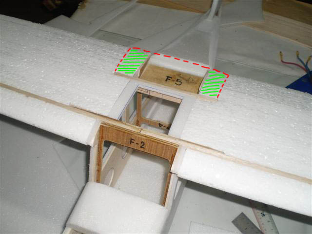 จากนั้นผมก็จะปิดหลังปีกด้วยไม้ตามที่ได้เขียนเอาไว้นะครับ ในภาพจะเห็นเส้นประสีแดงคือบริเวณที่ผมจะปิดครับ แถบสีเขียวนั้นผมจะต้องปาดเนื้อโฟมทิ้งออกไปตามความหนาของไม้ครับ เมื่อเรียบร้อยดีก็เอากาวทาไว้ซักหน่อยครับ..
