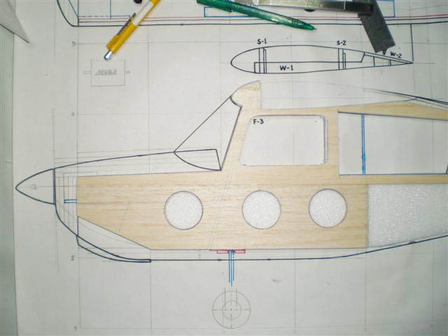 ผมมีไม้บาง 3 ม.ม.อยู่ครับถ้ามี 2 ม.ม.ก็จะดีมากเลยเพราะผมว่าแค่ 2 ม.ม.ก็พอแล้ว ย้อนไปดูใน ค.ต.ที่ผ่านมาว่าผมกำหนดเนื้อไม้ไว้แค่ไหนนะครับ จากนั้นก็ก๊อป แบบลงไม้ได้เลย..ตามอย่างในภาพนะครับ เน้นเส้นวางแท่นมอเตอร์ เส้นวางกงลำตัว และเส้นใต้ปีกด้วยครับ..