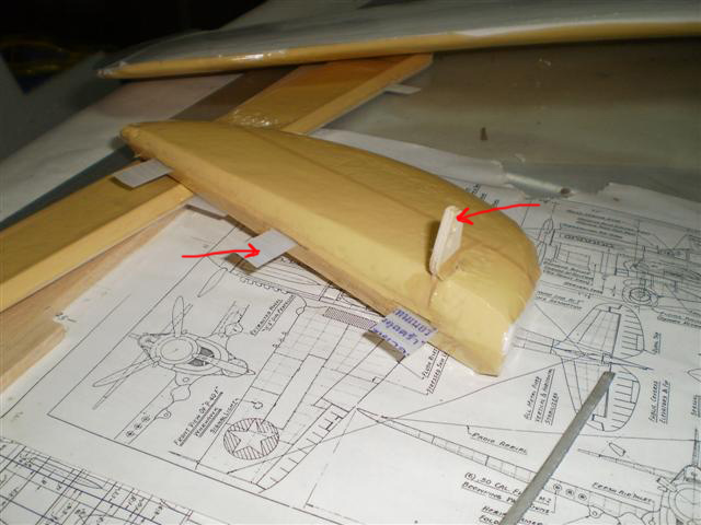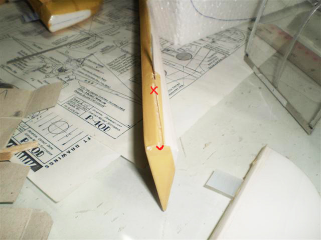 ที่แอร์ร่อนต้องทำร่องไว้ด้วยครับเพื่อจะฝังลวดคันชัก โดยผมบากเนื้อไม้ให้เป็นรูป V พอดีๆกับขนาดของลวด และเจาะรูลงไปในเนื้อตรงที่กากบาทแดงเอาไว้ครับ....อย่าลืมทำที่แผ่นเอลิฯด้วยนะครับทำเหมือนกัน