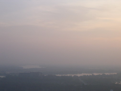 ท้องฟ้ายังมืด สลัวๆ มองเห็นลางๆ ตึกอบรมพนักงานธนาคารกสิกรไทย ริมฝั่งแม่น้ำบางปะกง