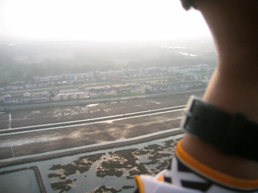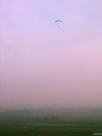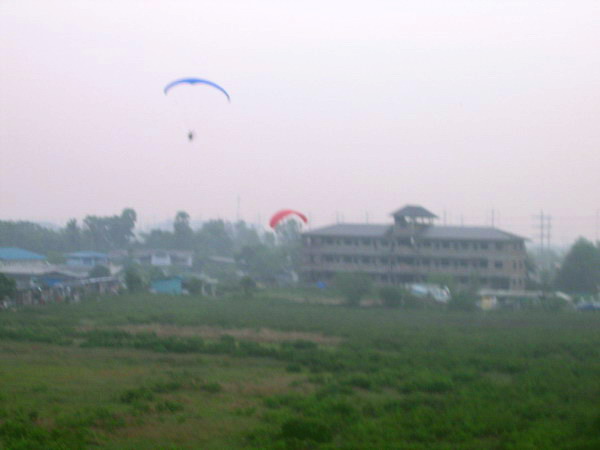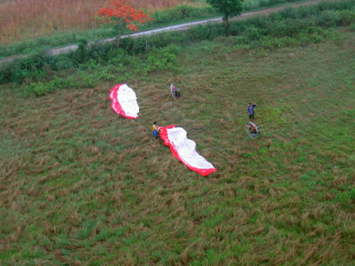 ครูทุย ขึ้นตามมาติดๆ แต่มีปัญหาเรื่องเครื่องยนต์ยังจูนไม่ดี เลยลงไปทำใหม่....ส่วนน้องต้น ร่มสีน้ำเงิน สายร่มขดกันเป็นปม " หางหมู " สังเกตจากภาพ จะเห็นท้ายร่มบุ๋มลงไป ต้องลงไปแก้เงื่อน...ทำให้การบินเดินทางต้องล่าช้าออกไป