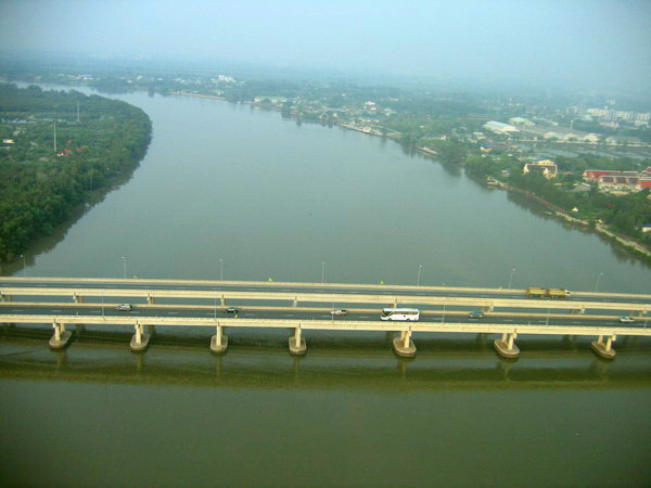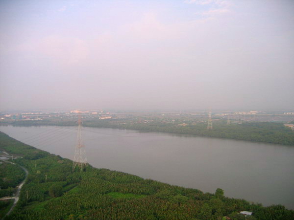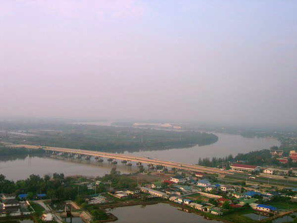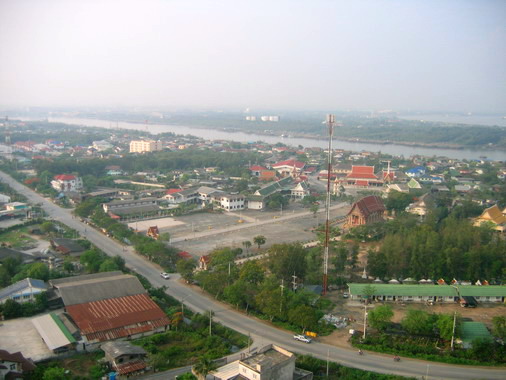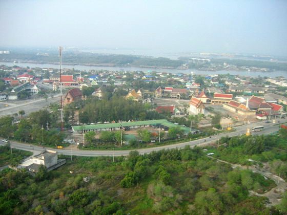 มองไปไกลๆ จะเห็น ปากอ่าวทะเล ที่แม่น้ำบางปะกงไหลมาสิ้นสุด ส่วนบริเวณบ้านเรือน ที่เห็นอยู่นี้ เป็นตลาดเก่าบางปะกง ชุมชนดั้งเดิม ริมฝั่งแม่น้ำบางปะกง