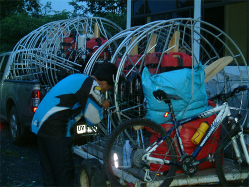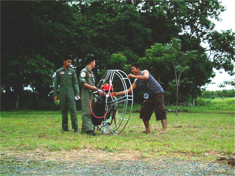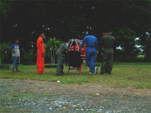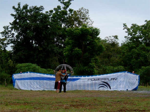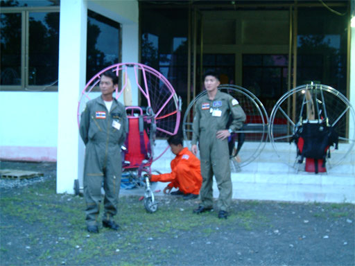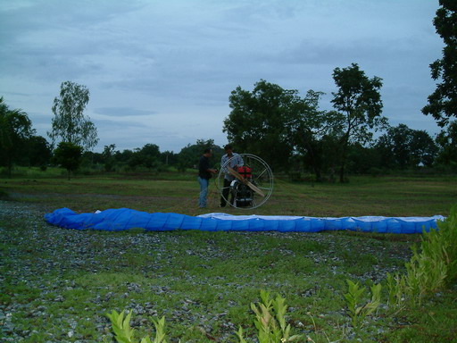 คุณทุยและคุณหงา กำลังเตรียมเครื่องเตรียมร่ม เพื่อขึ้นบินตั้งแต่ยังเช้าตรู่ครับ สังเกตได้จากภาพ ยังไม่สว่างเท่าไรเลย รันเวย์สองข้างทางเต็มไปด้วยเมกไม้ โอ้!! คุณพระคุณเจ้าช่วยลูกด้วย