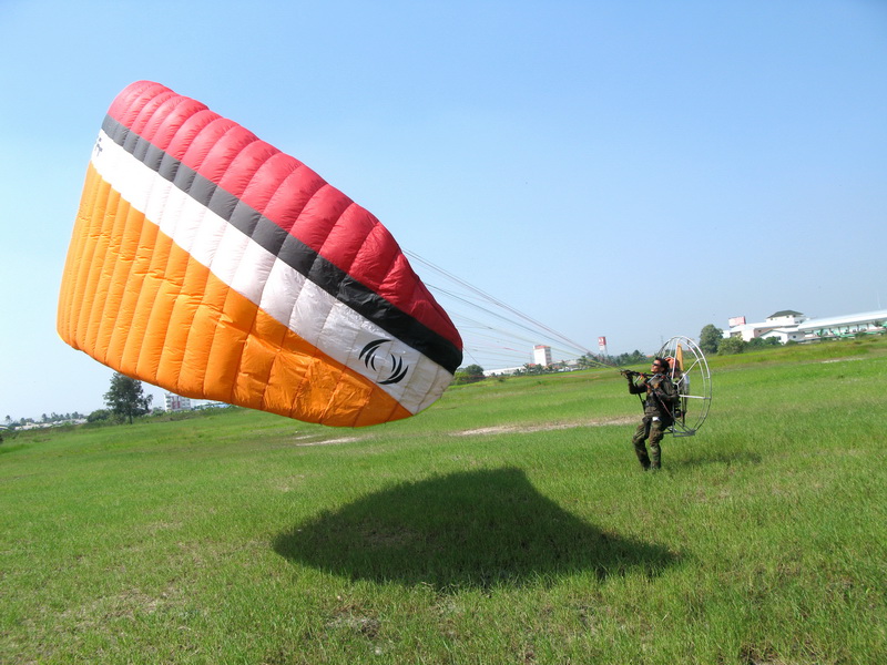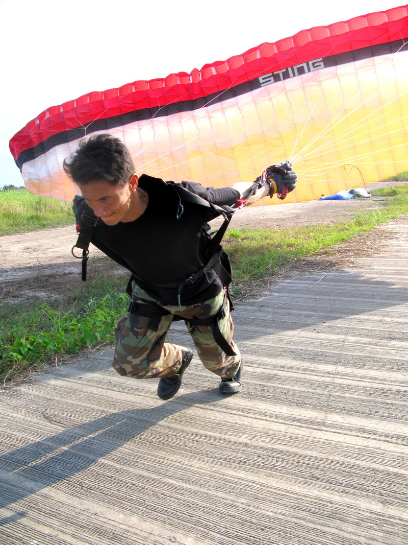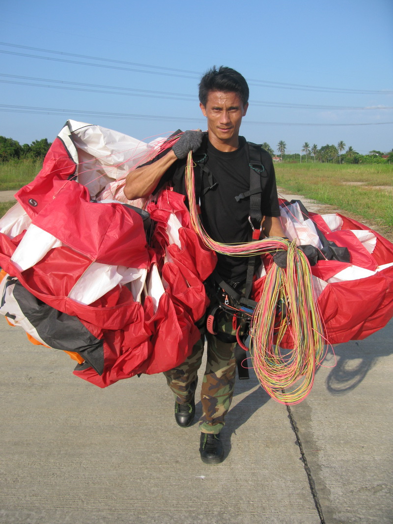 คุณราญเป็นนักดำน้ำของกองทัพเรือ และมาทำการฝึกบินกับผม(ครูแป๋ง)เริ่มมาเรียนเมื่อวันอาทิตย์(1/11/52)บ่ายๆ คุณราญแข็งแรงและทักษะดีมากสามารถเรียนรู้และทำการตั้งร่มในท่าForward ได้โดยใช้เวลาไม่นานเลยครับ ในภาพคุณราญกำลังแบกร่มเท่ห์มากๆ