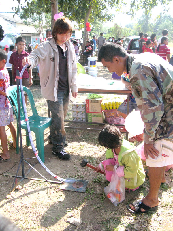 นี่ก็น่าสนใจครับเอามะเขือพวงมาใส่สายยางน้ำ ถ้าออกมาใครทุปด้วยค้อนได้ก็ชนะไปครับ น่ารักดีอิๆๆ