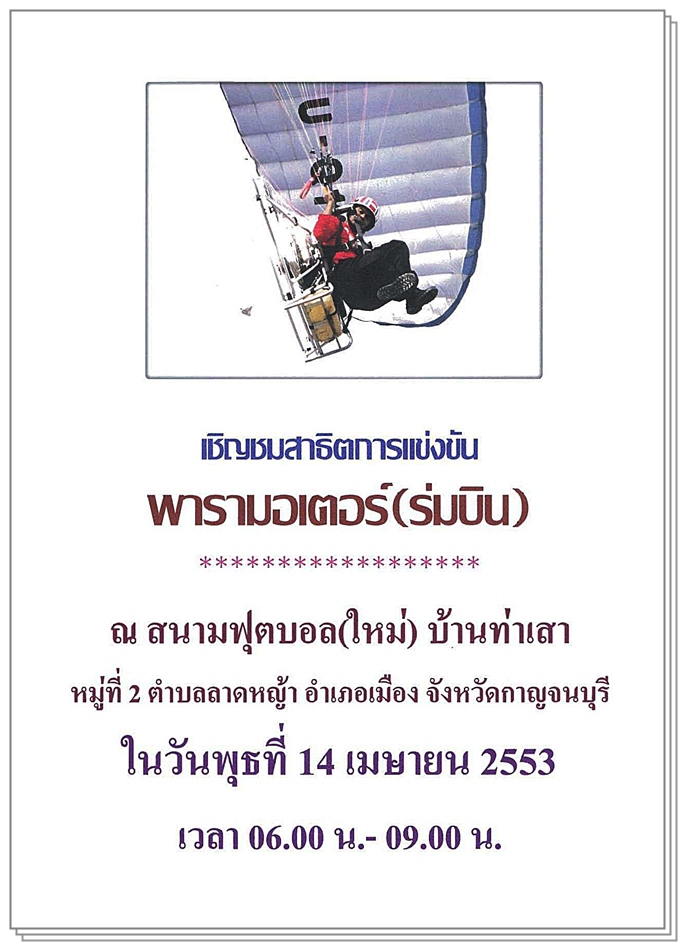 ประชาสัมพันธ์การแข่งขันร่มบินภายในชมรมนครปฐม เราจะย้ายสนามไปแข่งที่กาญจน์ เสียดาย ยศกับแขก ไม่งั้นขอไปร่วมแจมที่กาฬสินธุ์เหมือนปีที่ผ่านมา อยากไป ... แต่เสียดาย ทางเทศบาลลาดหญ้าเขากำหนดวันมาเนิ่นๆแล้ว ...