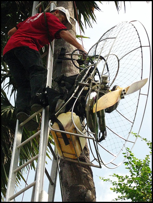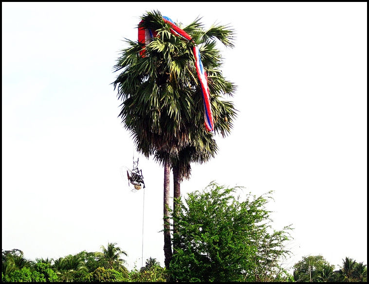สวัสดีครับน้าหมอตุ๋ย เห็นแกบอกว่ามองแต่สนาม มองแต่ช่องจะลง หันมาเห็นยอดตาลก็จะถึงแล้ว เสียบเข้าข้างๆครับ ไม่เป็นอะไรเลยแม้รอยข่วน 555 เครื่อง-ร่ม ไม่มีร่องลอยเสียหายเลยครับ เอาลงมาแล้ว ยังจะขึ้นบินแก้ตัวอีก ตายศมะขามเทศ ในฐานะนักบินยอดไม้รุ่นพี่เลยแนะวิธีบินครับ "คนเรามี 2ตา ก็เอาตาขวามองสนาม และก็เอาตาซ้ายมองต้นตาลสิ55555"