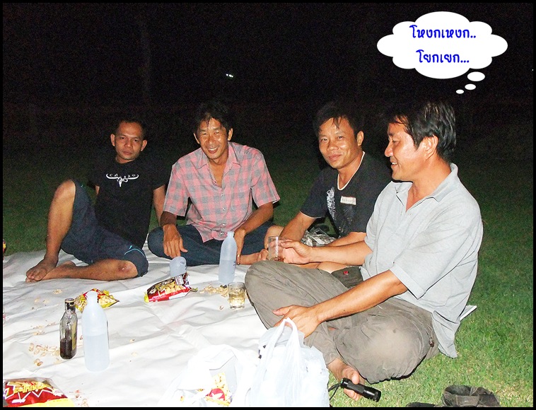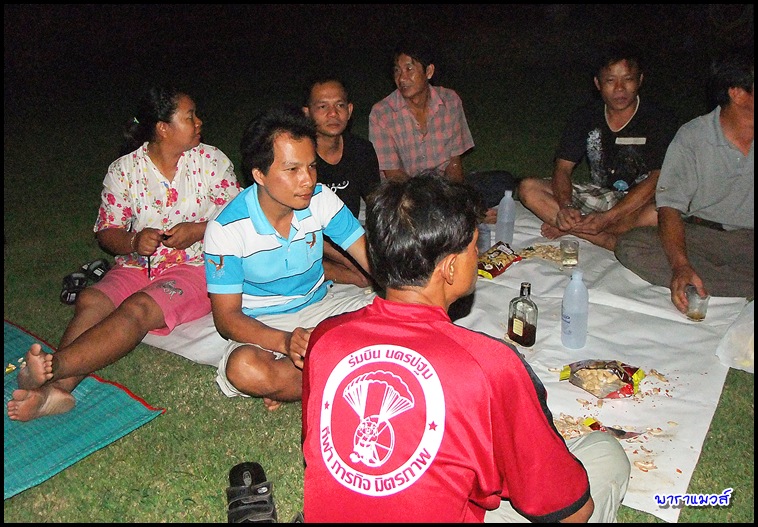 ดื่มกินกันจนเพ..ลา ..พอสมควร ใกล้ยามรุ่ง ก่อนจะมุดเข้าเต็นท์ใครเต็นท์มัน ทิ้งหลักฐานทั้งหมดไว้ตรงนั้น พวกเรานอนสักพัก ตื่นเช้าก็ไม่สนใจใยดีอะไร ล้างหน้าล้างตา เตรียมเครื่องร่มไปสนามทันที ที่เหลือคงเป็นหน้าที่ของแม่บ้านที่นอนข้างบนห้องแอร์ คอยตามเก็บหลักฐานเกลื่อนกลาดในตอนเช้า