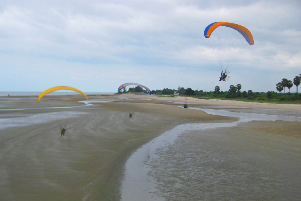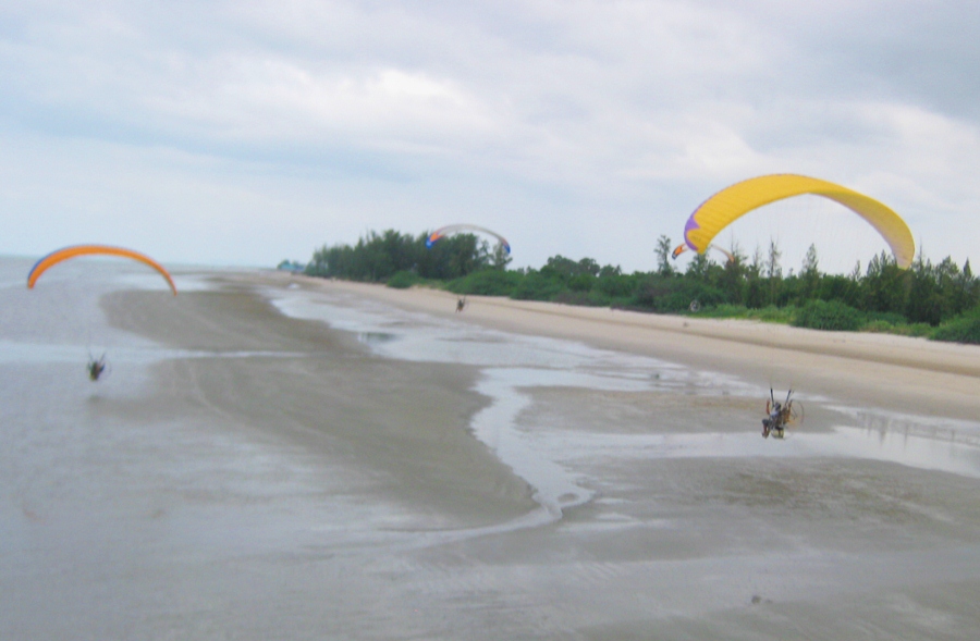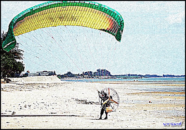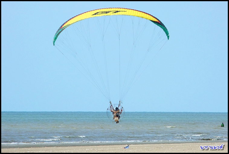 หลังจากกลับที่พักทานข้าวต้มกาแฟ เรียบร้อย ลมทะเลมาแล้ว ก็จัดเตรียมเครื่องร่ม หิ้วกันไปชายทะเล เพื่อบินเดินทางไปหาดชะอำ