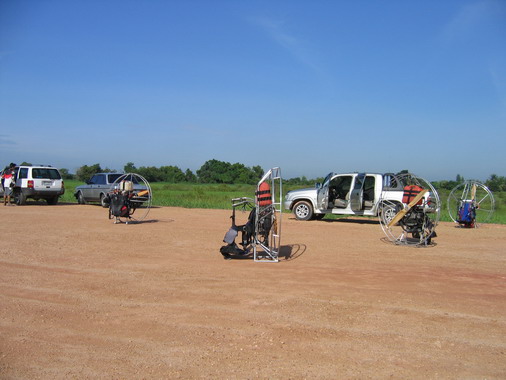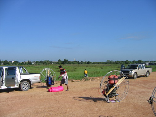 เครื่องยนต์พารามอเตอร์ วางเรียงราย....รอให้ท่อไอเสียหายร้อนเสียก่อน ค่อยยกขึ้นรถครับ