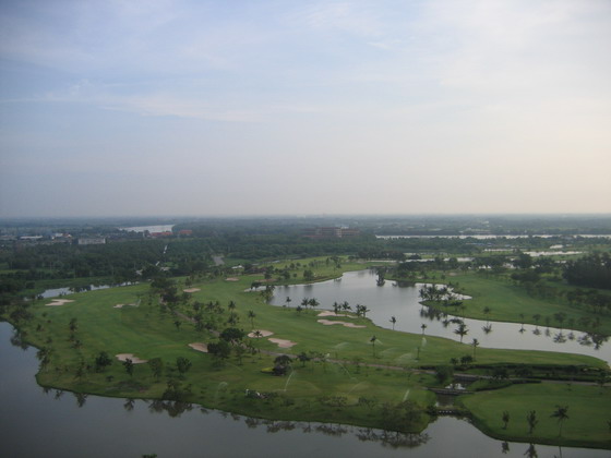 ภาพเก็บตก สนามกอล์ฟบางปะกงยามเช้า จะเห็นสปริงเกอร์ กำลังฉีดรดน้ำสนามอยู่