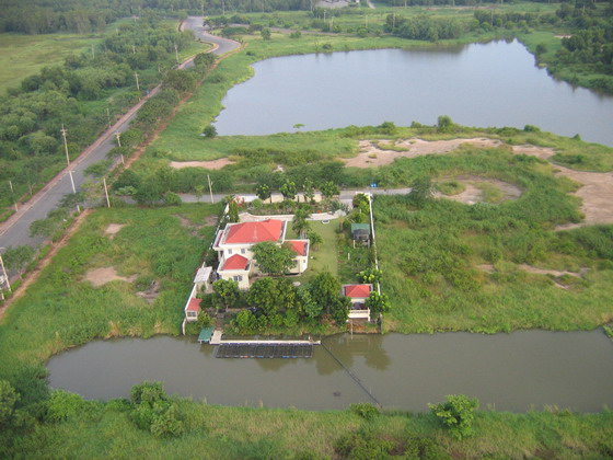บ้านสวยหลังหนึ่ง ใกล้สนามกอล์ฟบางปะกง หลังบ้านจะเห็นแพเลี้ยงปลาทอดยาวตลอด แพทางเดินริมน้ำ
