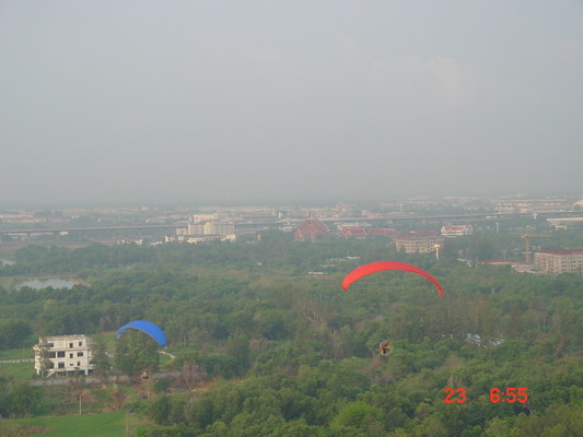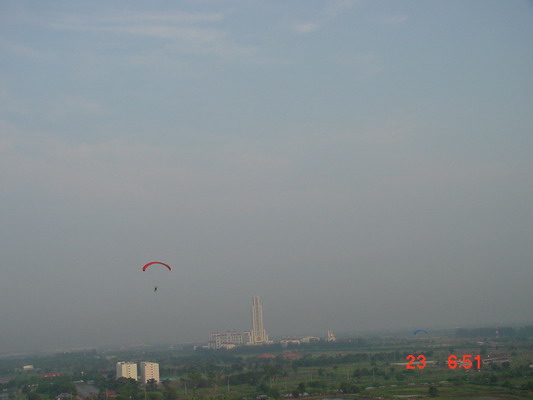 เห็นตึกเอแบคชัดแล้วครับ แล้วใครล่ะนี่ มาห้อยโตงเตงอยู่ในภาพ บินมาแต่เครื่องเปล่าๆ โดยไม่มีร่ม มันจะเกินไปแล้ว