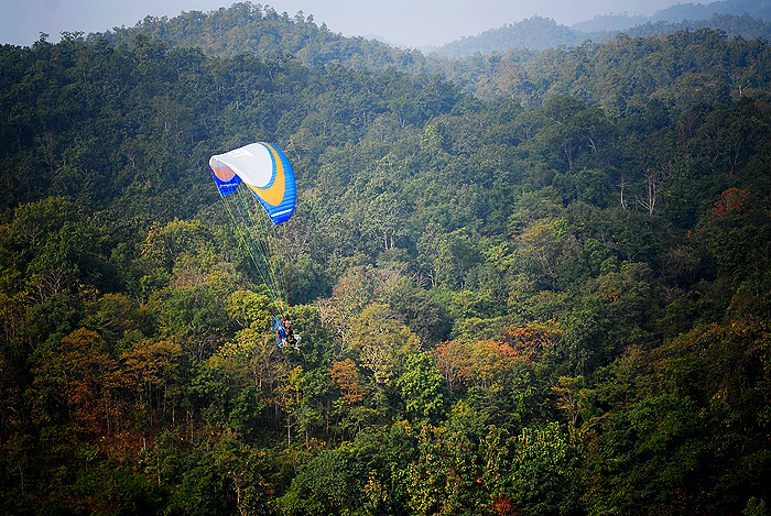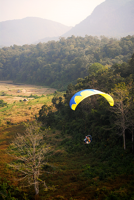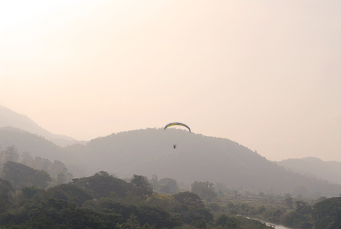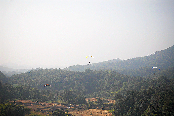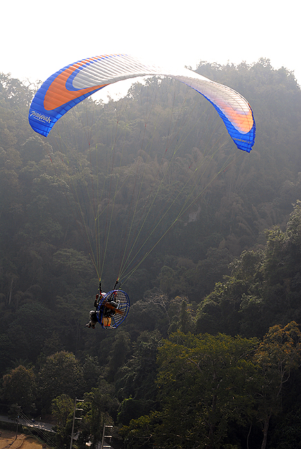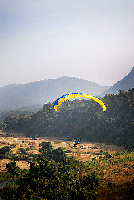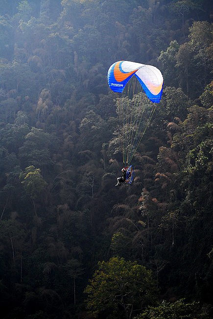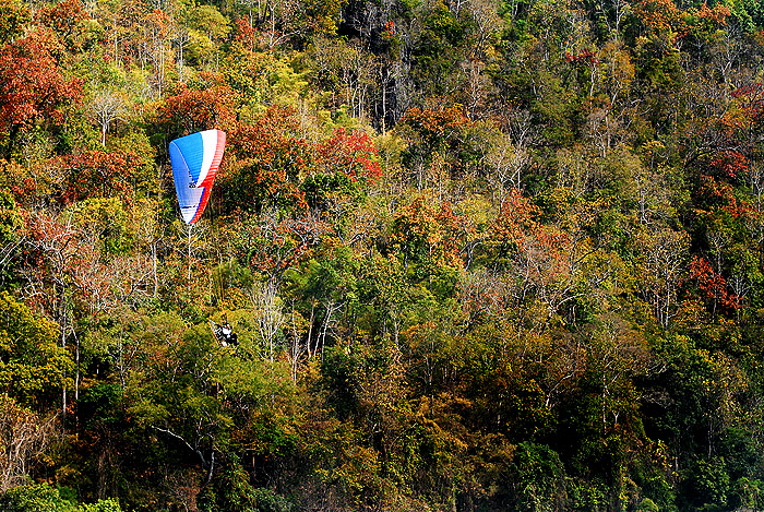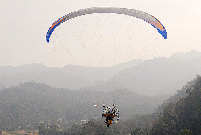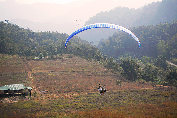 บางช่วงของเส้นทาง ที่แม่ฮ่องสอนทิวทรรศการบินของแต่ละอำเภอไม่เหมือนกันเลยครับ ที่แม่สะเรียงจะเป็นที่ราบกว้างๆแล้วมีลำนำ้ยวมตัดผ่านเราสามารถบินจาก อ.แม่สะเรียงมายัง อ.แม่ลาน้อยได้ครับ รับรองครับว่า"อะดีนาลีน"พุ่งกระฉูดเป็นแน่ครับ ส่วนแม่ลาน้อยก็เป็ฯที่ราบในช่องเขามีพื้นที่ป่าที่ต้องบินข้ามบ้าง ส่วนขุนยวมนี่เหมือนบินอยู่บนภูกระดึงเลยครับ แม่ฮ่องสอนนี่ก็ต่างไปครับมีทั้งป่าและทุ่งนาในหุบเขาแต่ลมภูเขาที่นี่ไม่เบาครับ ร่มผมที่ว่าแน่ๆพับเป็นประจำจนชาชินไปแล้วครับแต่ฤดูนี้เบาหน่อยครับ เพราะพื้นที่บินจะมีเขามากเลยทำให้ มักจะเกินลมหมุนวนหลังเขาบ่อยๆ ที่ปางมะผ้าเป็นเขาหินปูนสูงลิ๊บเลยครับมีพื้นที่ราบซุ๊กอยู่ในซอกเขาจริงๆส่วนปายก็น้อง เอฟ เคยนำบรรยากาศบางส่วนใส่ไปในไทยพารามอเตอร์แล้วครับตอนแก๊งส์ฟรายบอยมาบินอย่างที่เห็นครับที่โล่งๆกว้างๆบรรยากาศดีครับแต่ผู้ประกอบการที่พักที่มีมากมายที่นั่นไม่ชอบร่มบินเอามากๆครับคงจะกลัวพวกเราไปขึ้รดหัวเอา